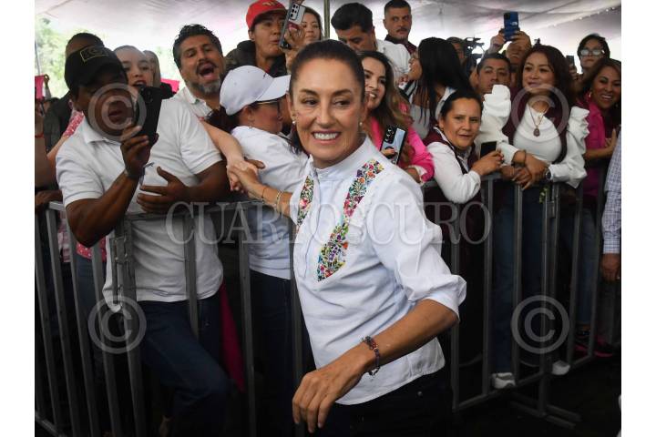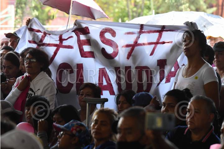 Simpatizantes durante la asamblea informativa de Claudia Sheinbaum, aspirante a coordinadora nacional de los comités de defensa de la Cuarta Transformación, realizada en el Deportivo de Santa Cruz Acatlán.