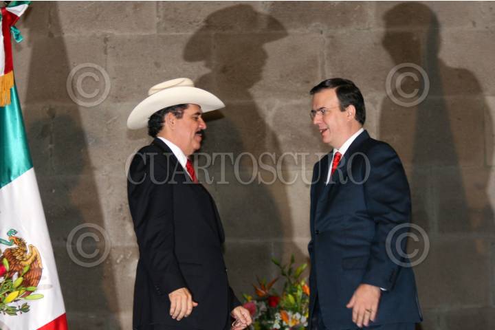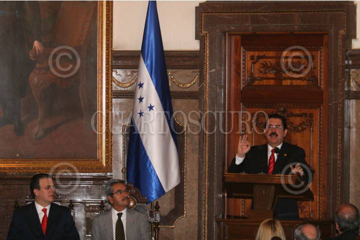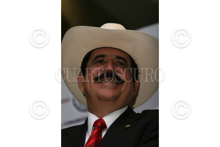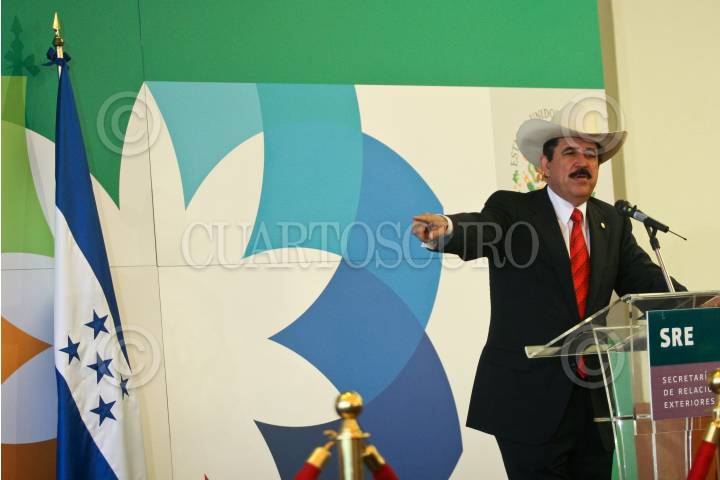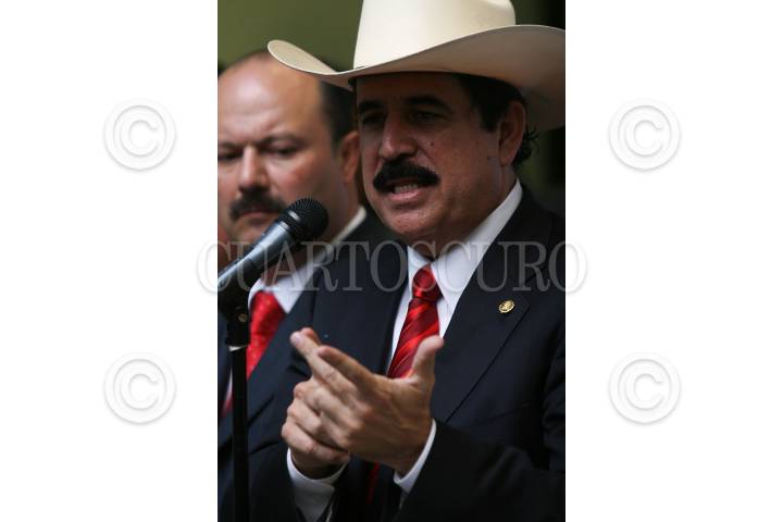 MÉXICO D.F., 04AGOSTO2009.- José Manuel Zelaya, presidente de Honduras, ofreció conferencia de prensa en la secretaría de Relaciones Exteriores, en el marco de su visita de Estado a nuestro país. FOTO: ISAAC ESQUIVEL/CUARTOSCURO.COM