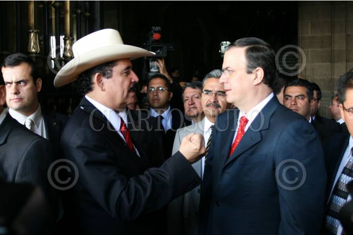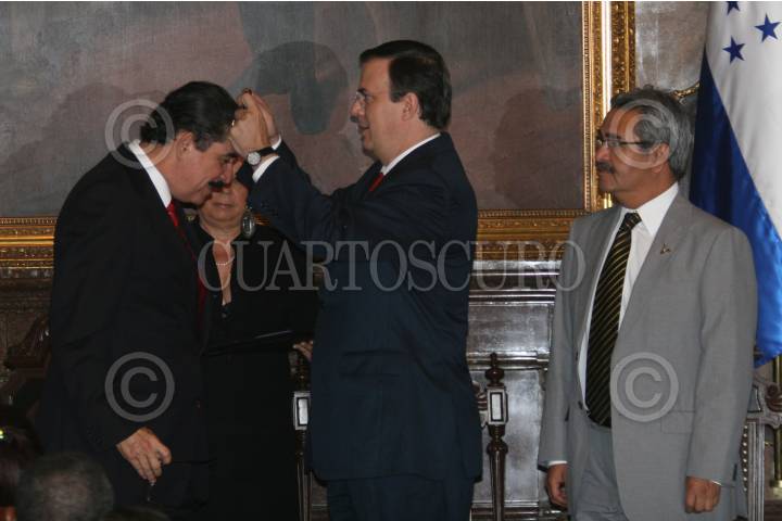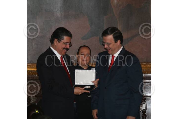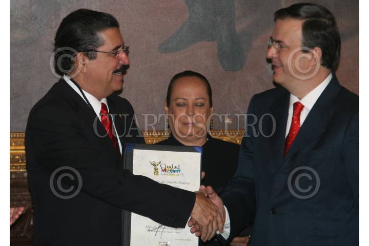 MÉXICO D.F., 05AGOSTO2009.- José Manuel Zelaya, Presidente depuesto de Honduras, acudió esta mañana a las instalaciones del Gobierno del Distrito Federal donde fue recibido por Marcelo Ebrad Casaubón, jefe de gobierno, quien le entrego las llaves de la ciudad una medalla y el pergamino que lo acredita como huésped distinguido de esta ciudad. FOTO: GUILLERMO PEREA /CUARTOSCURO.COM