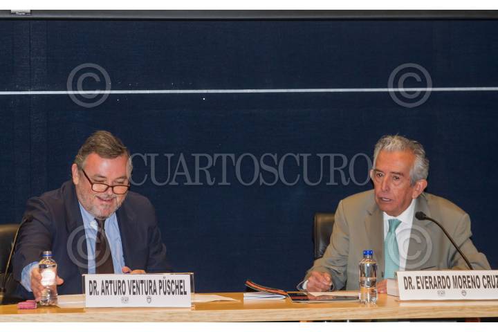 CIUDAD DE MÉXICO, 09OCTUBRE2018.-El doctor Arturo Ventura Püschel y el académico Everardo Moreno Cruz, durante el primer Congreso Internacional de "Derecho Penal 2018: Terrorismo, Trata de Personas y Nuevas Formas de Esclavitud, Corrupción y Tráfico de Drogas", que se realiza en la Facultad de Derecho de la UNAM. FOTO: ISAAC ESQUIVEL /CUARTOSCURO.COM