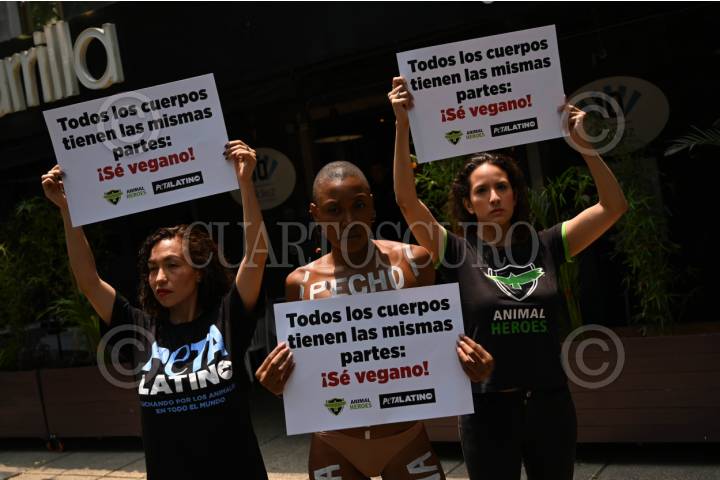 CIUDAD DE MÉXICO, 14MAYO2024.- Integrantes de PETA y Animal Heroes se manifestaron a favor de los derechos animales afuera de un restaurante donde se venden productos de carne. FOTO: DANIEL AUGUSTO/ CUARTOSCURO.COM