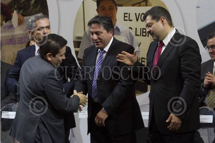 MÉXICO, D.F. 02JUNIO2015.- Miguel Ángel Mancera, Jefe de Gobierno, Armando Hernández Cruz, magistrado presidente del Tribunal Electoral del DF, Mario Velázquez Miranda, consejero presidente del Instituto Electoral del DF y José Ramón Amieva, consejero Jurídico capitalino, durante la sesión informativa de los derechos político-electorales de la personas con discapacidad en la Ciudad de México. FOTO: MOISÉS PABLO /CUARTOSCURO.COM