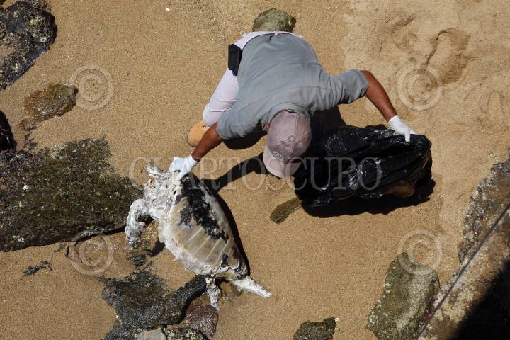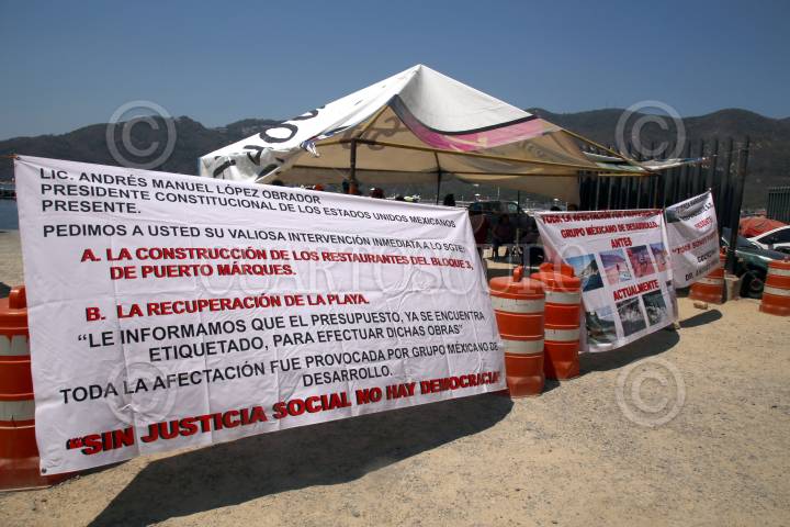 ACAPULCO, GUERRERO, 25MARZO2019.- Esta madrugada un barco que daba mantenimiento a la Marina Majahua se hundió derramando diesel en la bahía de Puerto Marquéz, prestadores de servicios turísticos y pescadores del lugar se organizaron y tomaron las instalaciones de la Marina Majahua manteniendo un plantón desde esta mañana, haciendo responsable a la constructora Grupo Mexicano de Desarrollo por las afectaciones al ecosistema de la bahía, ya que empezaron aparecer algunas especies muertas como una tortuga golfina, en el lugar ya se empiezan hacer labores de limpieza por parte de capitanía de puerto y por elementos de Marina Armada de México. FOTO: CARLOS ALBERTO CARBAJAL /CUARTOSCURO.COM