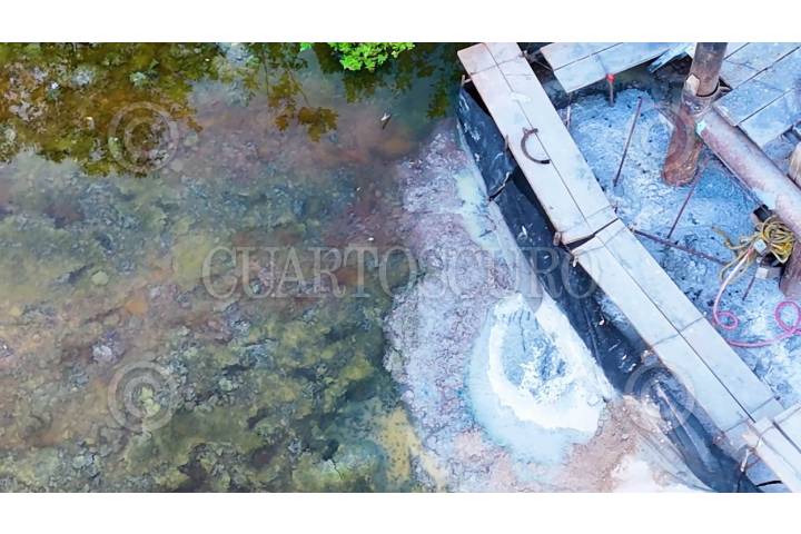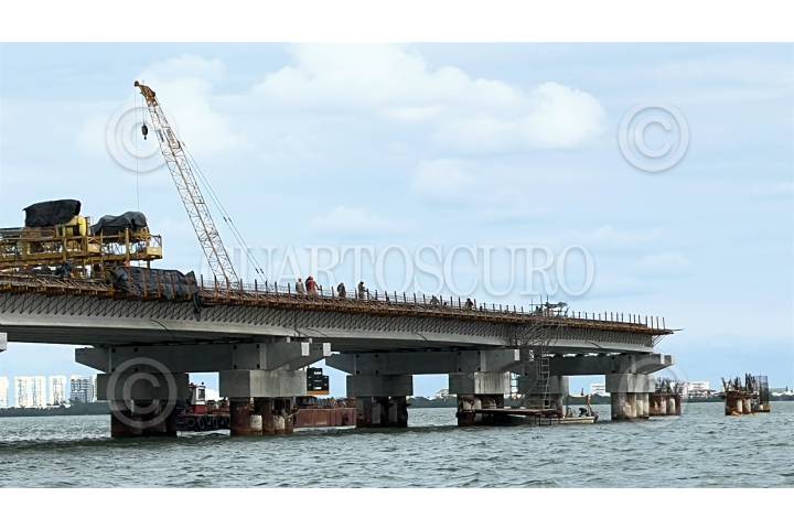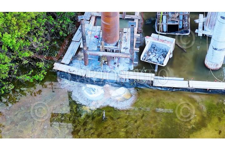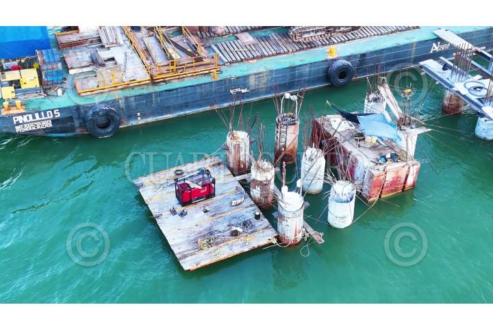 CANCÚN, QUINTANA ROO, 07MAYO2024.- Distintos ambientalistas denunciaron ayer, con fotos tomadas con un dron, un derrame de cemento en las obras del puente vehicular que se ubican en la Laguna Nichupté. A través de redes sociales, los activistas compartiendo estás imágenes que al parecer fueron tomadas por una persona que prefirió mantenerse en el anonimato. En las fotos se aprecia el derrame de cemento fuera de las cimbras de pilotaje, lo que estaría provocando contaminación de las aguas por la filtración que incluye aceites, situación que podría dañar de manera importante la zona de manglares. FOTO: ESPECIAL/CUARTOSCURO.COM