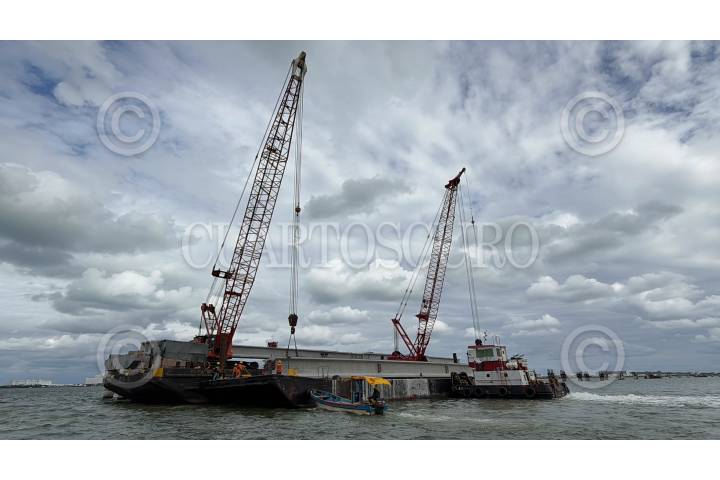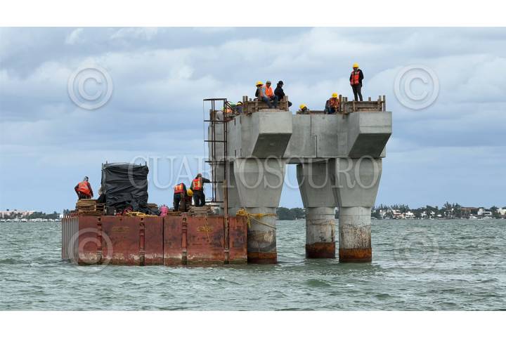 CANCÚN, QUINTANA ROO, 24ENERO2025.- Inspectores de la Procuraduría Federal de Protección al Ambiente (Profepa) identificaron residuos con olor a hidrocarburo tras el accidente de un camión revolvedora la noche del 23 de enero. El vehículo que transportaba mezcla de cemento para las obras del Puente Nichupté, se deslizó y cayó al cuerpo de agua sin que se reportaran personas lesionadas. Según el informe de la Profepa no se registró vertimiento de cemento en la laguna, pero se encontraron restos de un material negro con olor a hidrocarburo en la superficie del agua. Personal de la obra implementó barreras absorbentes de contención y una malla anti dispersante para evitar la propagación de aceites o hidrocarburos. Durante la mañana, la revolvedora fue retirada con el apoyo de dos grúas y un carguero. En el sitio también estuvieron presentes representantes de la Comisión Nacional de Áreas Naturales Protegidas (Conanp), la Secretaría de Marina (Semar) y Capitanía de Puerto. La Laguna Nichupté forma parte del Área de Protección de Flora y Fauna Manglares de Nichupté, decretada como zona protegida en 2008. Este ecosistema alberga manglares, selvas bajas y petenes, además de una gran biodiversidad. FOTO: ELIZABETH RUIZ/CUARTOSCURO.COM