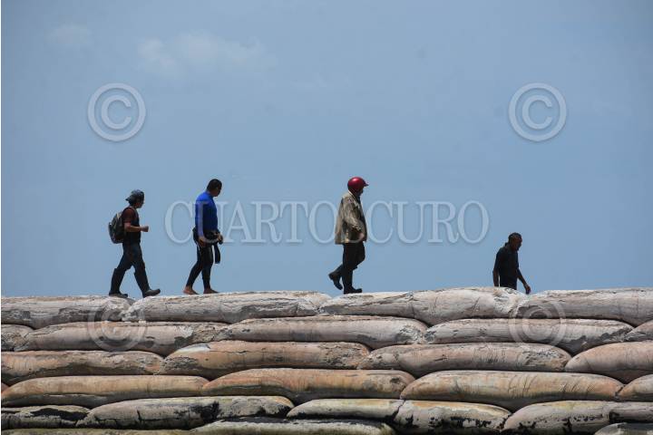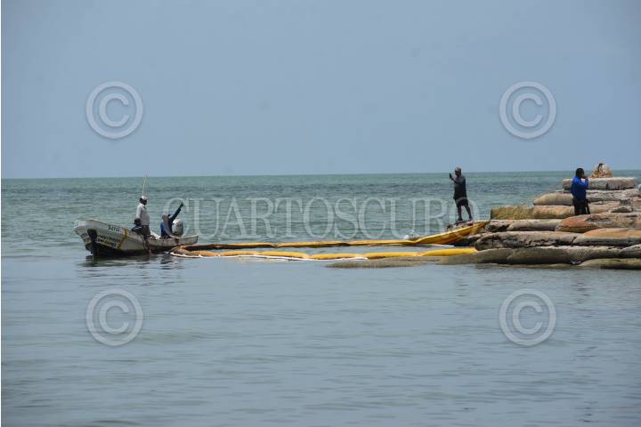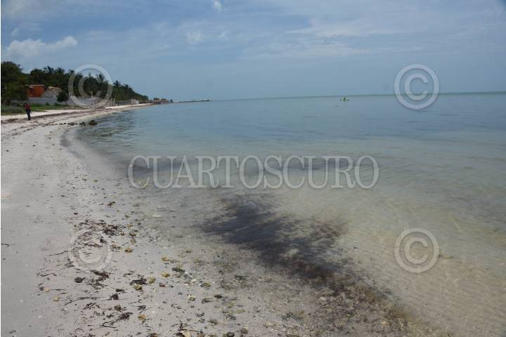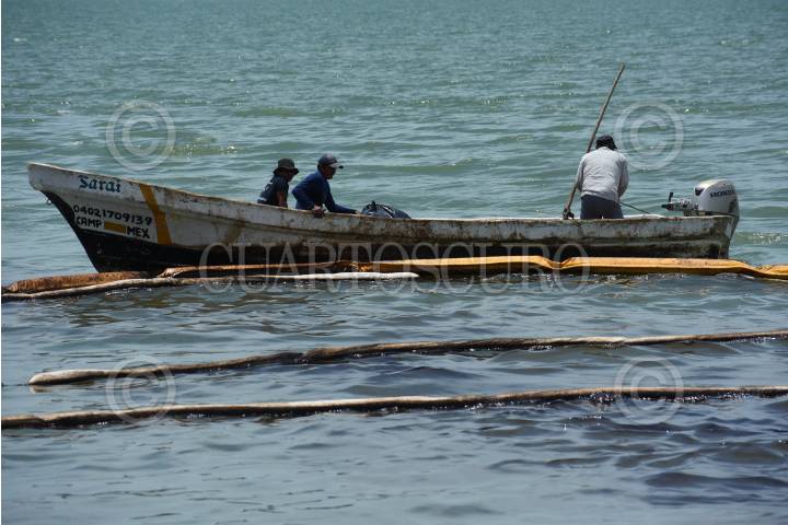 Continúan los trabajos de limpieza y detención de manchas de combustóleo en orillas de la playa de Campeche, a pesar de que trabajadores han contenido partes de crudo que el mar está arrojando, el olor a combustóleo se percibe desde la entrada a la playa.