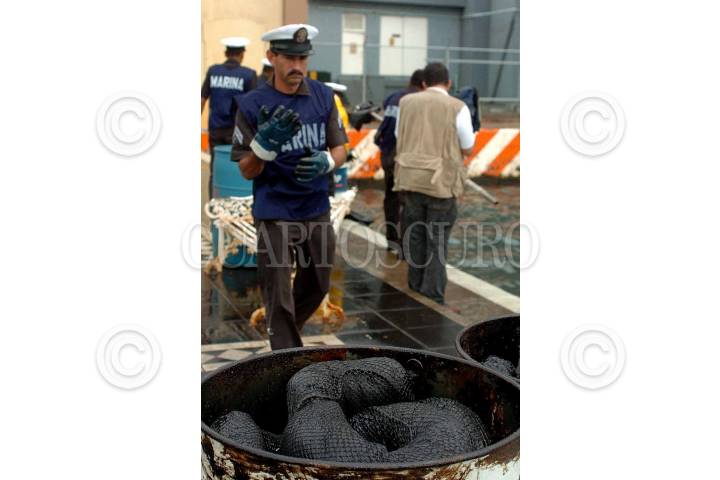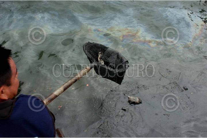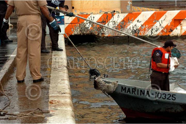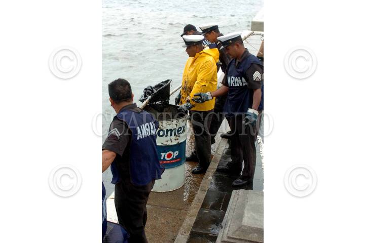 VERACRUZ, VER., 11OCTUBRE2007.- Este medio día se descubrió una densa capa de algún hidrocarburo, al parecer chapopote, dentro del recinto portuario. Por lo que elementos de la secretaria de marina realizaron labores de limpieza, así como el localizar el lugar de donde se originó el derrame. Las primeras versiones indican que se filtro a través del mismo sistema de drenaje de la zona portuaria. FOTO: JOSÉ CANDELARIO/CUARTOSCURO.COM