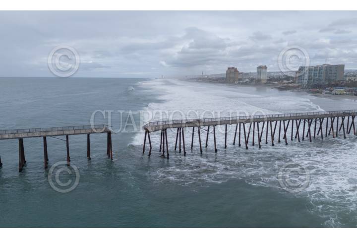 TIJUANA, BAJA CALIFORNIA, 19FEBRERO2024.- El muelle del Hotel Rosarito, amaneció sin un tramo de su estructura, el cual, aparentemente fue destruido por el alto oleaje. Este muelle estuvo cerrado por casi 10 años y después de un largo periodo de reparaciones y restauración, fue reabierta una parte para el sector turístico el verano del 2022. En los últimos meses la zona del andador turístico se ha visto azotada por fuertes y constantes oleajes, razón por la cual la estructura recibió mucho daño. El Presidente del Consejo del Hotel Rosarito, Hugo Antonio Torres Ramírez, declaró que el área afectada es la misma que se encuentra cerrada al público, debido al debilitamiento por el alto oleaje. Agregó que esa área no era apta para su remodelación y lo más viable era su demolición, trabajo que la misma naturaleza se encargó de realizar. El área que se encuentra abierta al público es totalmente segura, ya que cuenta con mantenimiento continuo por parte de la empresa Estructuras y Puertos de Ensenada. FOTO: OMAR MARTÍNEZ /CUARTOSCURO.COM