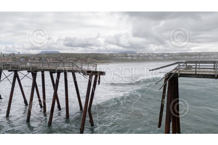 ROSARITO, BAJA CALIFORNIA, 19FEBRERO2024.- El muelle del Hotel Rosarito, amaneció sin un tramo de su estructura, el cual, aparentemente fue destruido por el alto oleaje. Este muelle estuvo cerrado por casi 10 años y después de un largo periodo de reparaciones y restauración, fue reabierta una parte para el sector turístico el verano del 2022. En los últimos meses la zona del andador turístico se ha visto azotada por fuertes y constantes oleajes, razón por la cual la estructura recibió mucho daño. El Presidente del Consejo del Hotel Rosarito, Hugo Antonio Torres Ramírez, declaró que el área afectada es la misma que se encuentra cerrada al público, debido al debilitamiento por el alto oleaje. Agregó que esa área no era apta para su remodelación y lo más viable era su demolición, trabajo que la misma naturaleza se encargó de realizar. El área que se encuentra abierta al público es totalmente segura, ya que cuenta con mantenimiento continuo por parte de la empresa Estructuras y Puertos de Ensenada. FOTO: OMAR MARTÍNEZ /CUARTOSCURO.COM