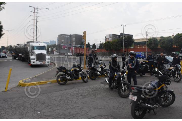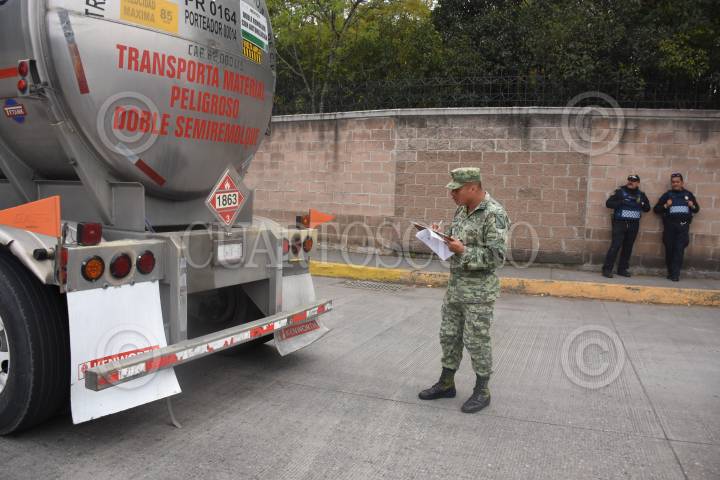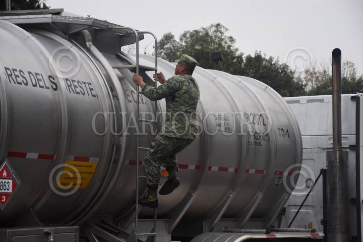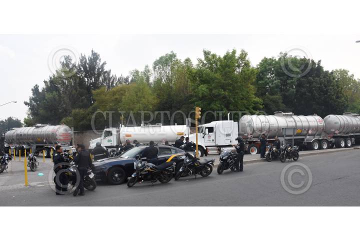 CIUDAD DE MÉXICO, 12ENERO2019.- El ducto Tuxpan-Azcapotzalco fue reabierto y la distribución del combustible a partir de pipas continuó con más afluencia en la capital del país, la Cámara Nacional del Autotransporte de Carga (CANACAR) apoyó con algunos de sus transportes y al igual que las pipas de Pemex, fueron protegidas por elementos de la SSC que los acompañaban a sus destinos mientras que elementos del ejército sigue protegiendo las inmediaciones de la refinería. FOTO: CRISOSTOMO SOTELO / CUARTOSCURO.COM