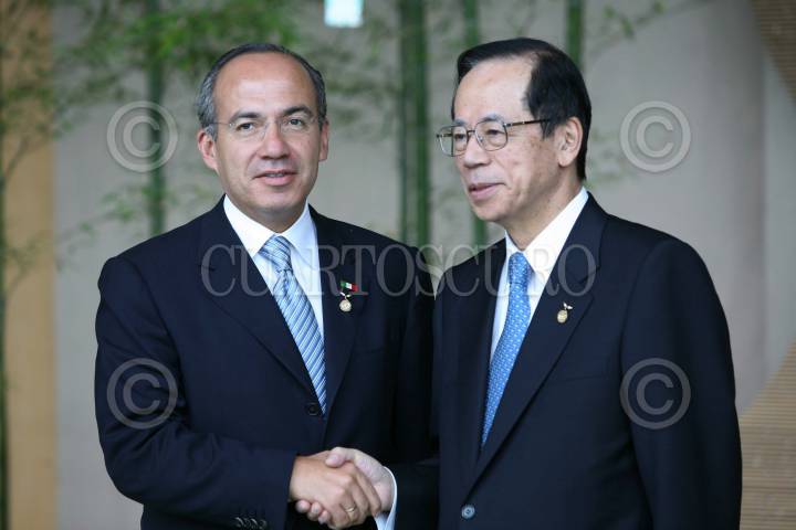 TOYACO, JAPON, 09JULIO2008.- Felipe Calderón Hinojosa, Presidente de México, saluda a Yasuo Fukuda, Primer Ministro de Japón, cuando arribaron a la sesión matutina de trabajo del Grupo de los 8 y del G5, que se realizó en el hotel Windsor. FOTO: ARIEL GUETIERREZ/CUARTOSCURO.COM