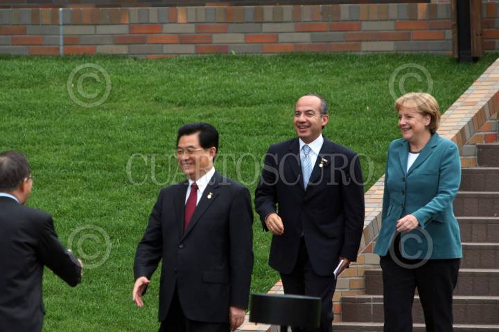 TOYACO, JAPON, 09JULIO2008.- Felipe Calderón Hinojosa, Presidente de México y Angela Merker, Primer Ministro de Alemania, se alistan para la toma de la foto oficial de la reunión del Grupo de los 8 y del G5, que se realizó en la explanada del hotel Windsor. FOTO: ARIEL GUTIERREZ/CUARTOSCURO.COM