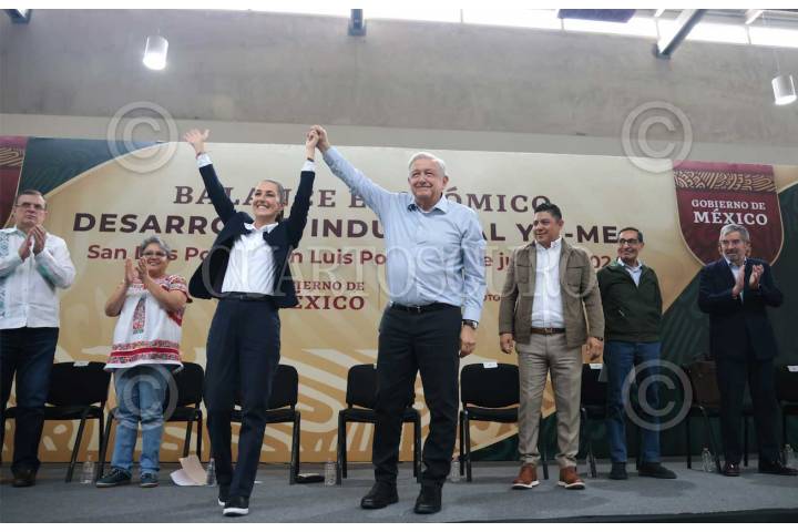 SAN LUIS POTOSÍ, SAN LUIS POTOSÍ, 20JULIO2024.- Andrés Manuel López Obrador, presidente de México y Claudia Sheinbaum Pardo, virtual presidenta electa de México, encabezaron el acto protocolario "Balance económico: desarrollo industrial y T-MEC" en el en Centro de Convenciones de San Luis Potosí. Los acompañaron: Marcelo Ebrard Casaubón, próximo secretario de Economía; Raquel Buenrostro Sánchez, secretaria de Economía; Ricardo Gallardo Cardona, gobernador Constitucional del Estado de San Luis Potosí; Rogelio Ramírez de la O, secretario de Hacienda y Crédito Público; Juan Ramón de la Fuente Ramírez, próximo secretario de Relaciones Exteriores y Juan Pablo de Botton Falcón, subsecretario de Egresos de la Secretaría de Hacienda y Crédito Público. FOTO: PRESIDENCIA/CUARTOSCURO.COM