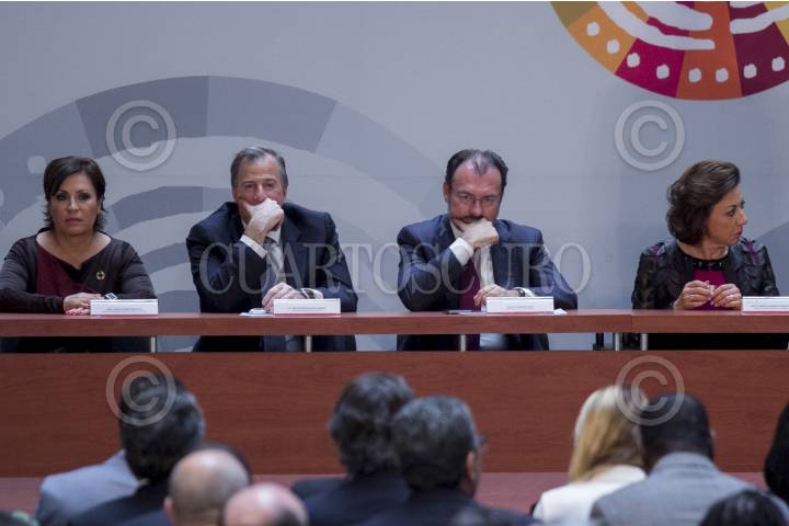 CIUDAD DE MÉXICO, 26ABRIL2017.- Rosario Robles, titular de Desarrollo Agrario, Territorial y Urbano (Sedatu); José Antonio Meade Kuribreña, secretario de Hacienda y Crédito Público; Luis Videgaray Caso, secretario de Relaciones Exteriores, y Guadalupe Murguía, presidenta de la mesa de la Cámara de Diputados, durante la primera reunión del foro de los países de América Latina y el caribe sobre desarrollo sostenible, en Palacio Nacional. FOTO: GALO CAÑAS /CUARTOSCURO.COM