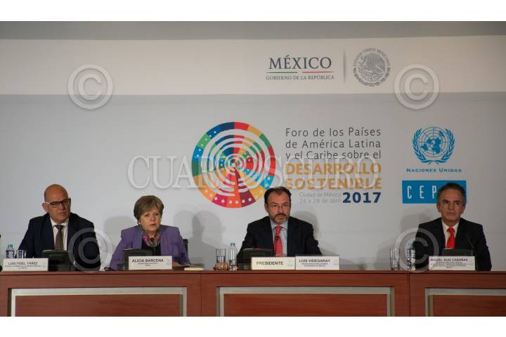 CIUDAD DE MÉXICO, 28ABRIL2017.- Luis Videgaray, secretario de Relaciones Exteriores de México (SRE), Alicia Barcena, secretaria ejecutiva CEPAL; Luis Fidel Yañez, oficial a cargo de la secretaría de la CEPAL; Miguel Ruíz Cabañas, subsecretario para asuntos multilaterales y derechos humanos de la Secretaria de Relaciones Exteriores, en la clausura de la Primera Reunión del Foro de los Países de América Latina sobre Desarrollo Sostenible (CEPAL), donde se presentaron las conclusiones sobre los desafíos regionales de la implementación de la Agenda 2030. FOTO: MARIO JASSO /CUARTOSCURO.COM