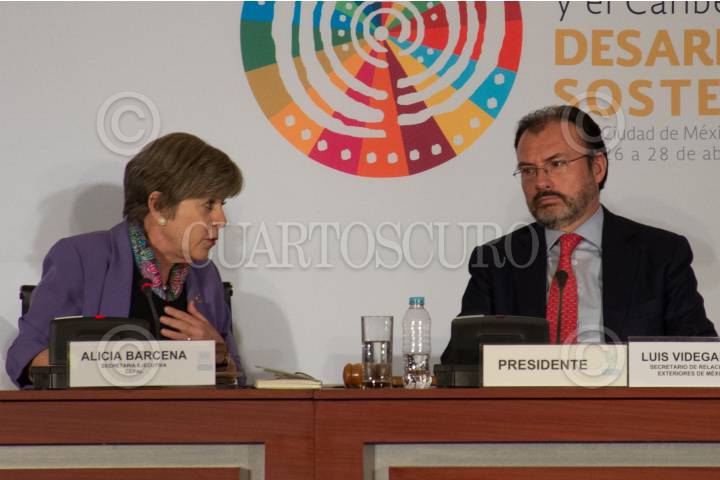 CIUDAD DE MÉXICO, 28ABRIL2017.- Luis Videgaray, secretario de Relaciones Exteriores de México (SRE), Alicia Barcena, secretaria ejecutiva CEPAL; durante la clausura de la Primera Reunión del Foro de los Países de América Latina sobre Desarrollo Sostenible (CEPAL), donde se presentaron las conclusiones sobre los desafíos regionales de la implementación de la Agenda 2030. FOTO: MARIO JASSO /CUARTOSCURO.COM