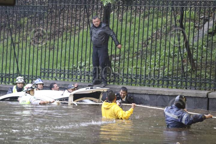 CIUDAD DE MÉXICO, 28JUNIO2017.- Una fuerte tromba inundó la parte norponiente de la Ciudad de México dejando afectaciones las principales avenidas. En la imagen personal de de transito de la SSSPCDMX rescatan a personas de vehículos inundados en el cruce de las avenidas Circuito Interior y Reforma. FOTO: SAÚL LÓPEZ /CUARTOSCURO.COM