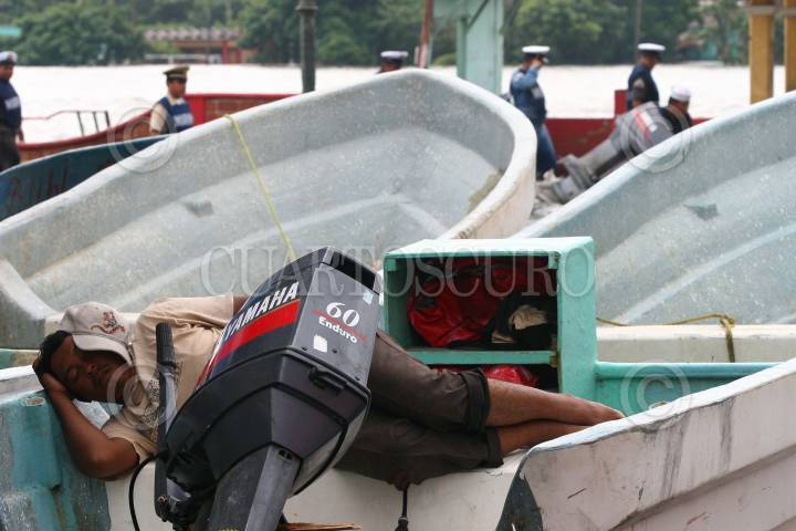 MINATITLAN, VERACRUZ., 04OCTUBRE2008.- Un lanchero que ayuda a trasportar a personas que se encuentran afectadas por la fuerte inundacion que sufre el sur del estado, duerme en su lancha, despues de trabajar alrededor de 12 a 14 horas. FOTO: SAÚL LÓPEZ/CUARTOSCURO.COM