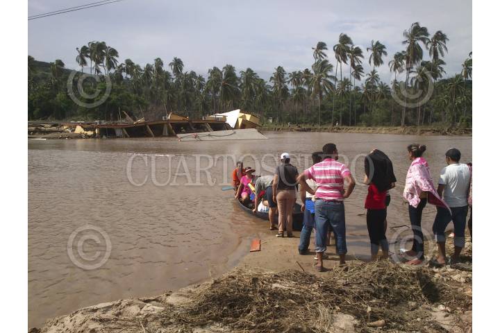 COYUCA DE BENÍTEZ, 21GUERRERO2013.- Personas esperan cruzar una crecida de río en búsqueda de ayuda, luego de que las vialidades hacia a este poblado quedaron severamente afectadas por las fuertes lluvias de los dos meteoros Ingrid y Manuel. FOTO: GUILLERMO PEREA /CUARTOSCURO.COM