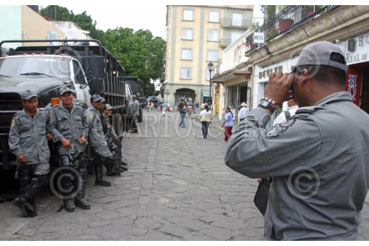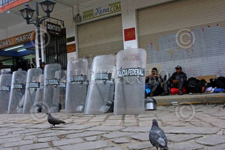 OAXACA, OAXACA 03 DE NOVIEMBRE 2006.- Elementos de la PFP descansan después de su cambio de guardia durante el resguardo al centro de la ciudad. FOTO: CARLOS SALINAS/CUARTOSCURO.COM