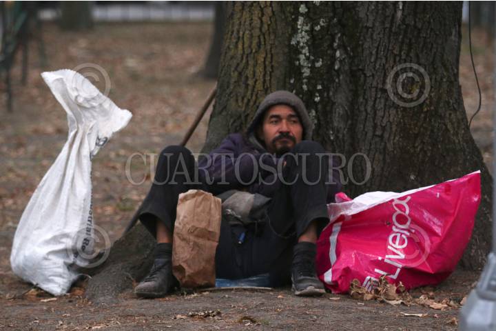 Hombre en situación vulnerable descansa recargado en un árbol dentro de las jardineras del Parque México.
