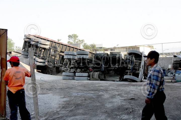 MÉXICO D.F. 10 ABRIL 2006.- En las callles de Guadalupe y calle 6 en Pantitlan, se volco un trailer, en el interior de una empresa tabiquera el ralizar maniobras de descargas de arena. FOTO:Pedro Marrufo / CUARTOSCURO.COM
