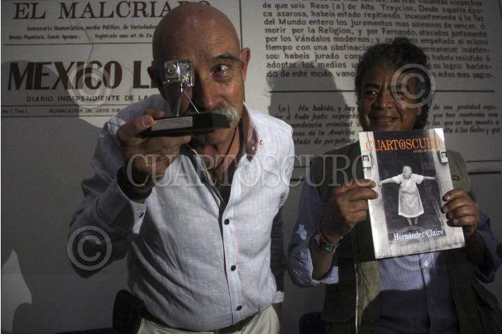 Esta tarde falleció a los 72 años de edad el fotógrafo José Hernández-Claire a causa de un infarto, confirmaron familiares.En la imagen, José Hernández-Claire, acompañado de Pedro Valtierra, fotoperiodista y director de la Agencia Cuartoscuro, durante la entrega de premios del concurso Nacional de Fotografía Cuartoscuro 2014, “De Aquí Soy".