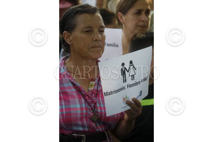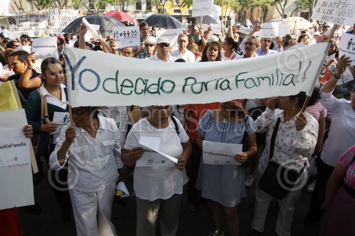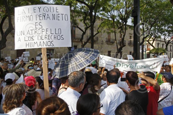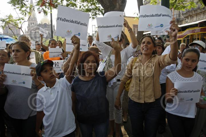 GUADALAJARA, JALISCO, 01JUNIO2016.- Esta tarde la decenas de personas del Frente Nacional por la Familia se manifestaron en la plaza de la Liberación para mostrar su descontento a una ley que firmo el Presidente de la Republica de México, Enrique Peña Nieto, en donde se favorece el matrimonio entre personas del mismo sexo. FOTO : FERNANDO CARRANZA GARCIA / CUARTOSCURO.COM