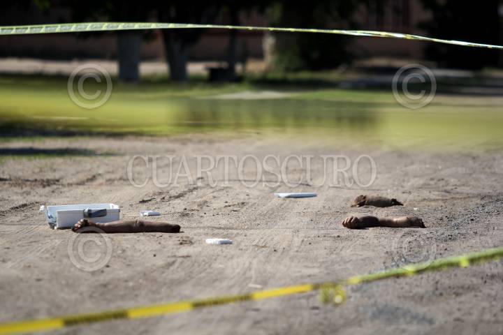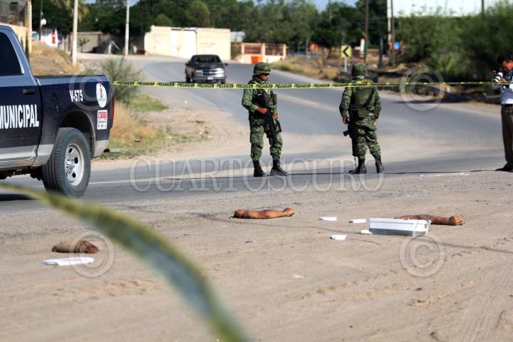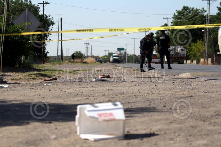 CIUDAD JUÁREZ, CHIHUAHUA, 13JUNIO2019.- Los cuerpos descuartizados de varios hombres fueron arrojados durante la madrugada a orillas de la carretera Juárez-Porvenir, en el Valle de Juárez, a la altura de los poblados San Agustín y Jesús Carranza. Parte de los restos, entre estos un par de brazos fueron encontrados al amanecer junto a una hielera de nieve seca, en zona habilitación, a un costado de la cinta asfáltica. Otros miembros cercenados fueron encontrados por agentes municipales y elementos castrenses entre los surcos de un sembradío. La carretera fue cerrada parcialmente en tanto se hacía el levantamiento y los peritajes. Apenas ayer miércoles, tres hombres fueron ejecutados y dos mujeres lesionadas en la misma comunidad de San Agustín y en La Colorada. FOTO: NACHO RUIZ /CUARTOSCURO.COM