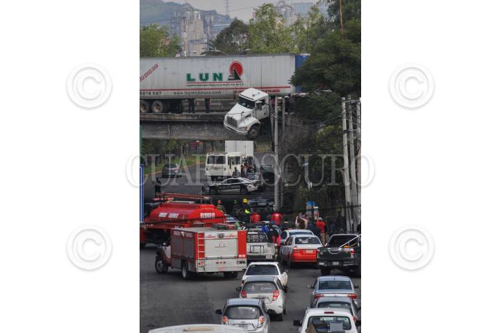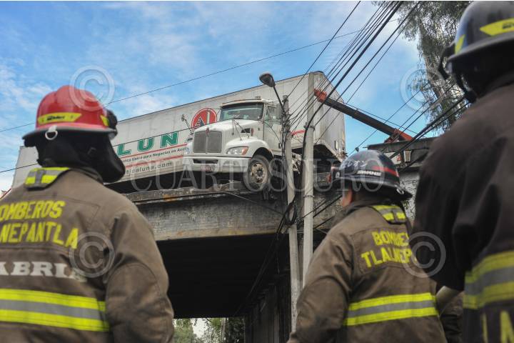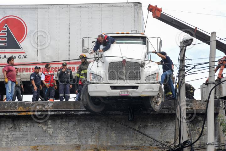 TLALNEPANTLA, ESTADO DE MÉXICO, 02NOVIEMBRE2018.- Bomberos y elementos de proteccion civil de Tlalnepantla, auxiliaron a un trailer que casi cae del puente vehícular de Tequesquinahuac, ubicado en las avenidas Reyes Heroles y Gustavo Baz FOTO: ARMANDO MONROY /CUARTOSCURO.COM