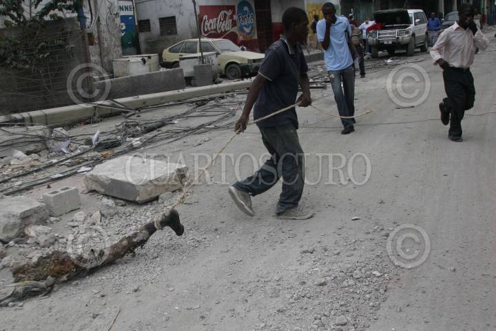 PUERTO PRÍNCIPE, HAITI, 26ENERO2010.-Haitianos desentierran dos cuerpos sepultados por los escombros para incinerarlos en una de las calles del centro de Puerto Príncipe. FOTO: ISAAC ESQUIVEL/CUARTOSCURO.COM