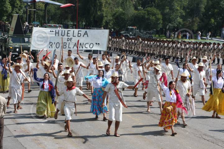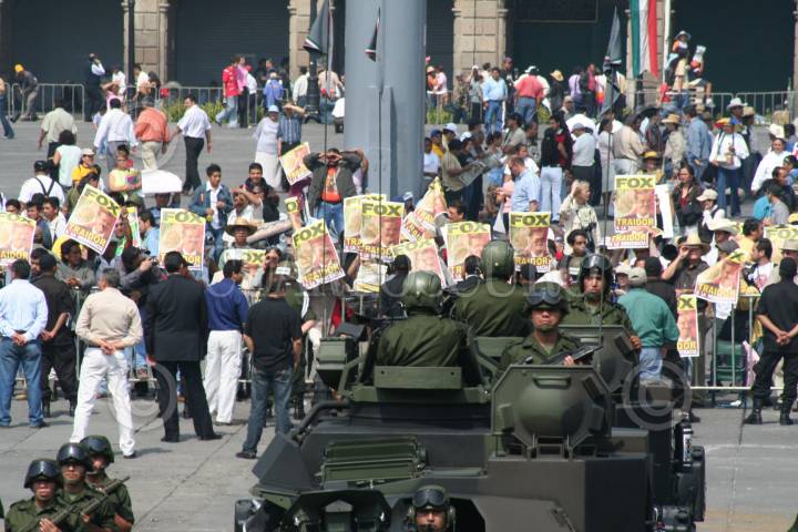 MÉXICO, D.F. 16SEPTIEMBRE2006.- Al finalizar el desfile conmemorativo de la gesta de independencia, simpatizantes de López Obrador mostraron pancartas y gritaron consignas al presidente Vicente Fox y a los soldados que permanecían en la plancha del Zócalo. FOTO: PAOLA HIDALGO/CUARTOSCURO.COM