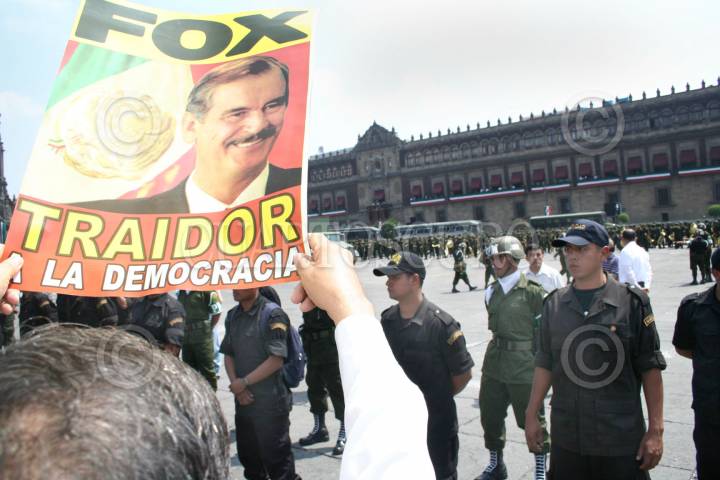 MÉXICO, D.F. 16SEPTIEMBRE2006.- Al finalizar el desfile conmemorativo de la gesta de independencia, simpatizantes de López Obrador mostraron pancartas con la leyenda "Traidor a la Democracia" y gritaron consignas al presidente Vicente Fox y a los soldados que permanecían en la plancha del Zócalo. FOTO: PAOLA HIDALGO/CUARTOSCURO.COM