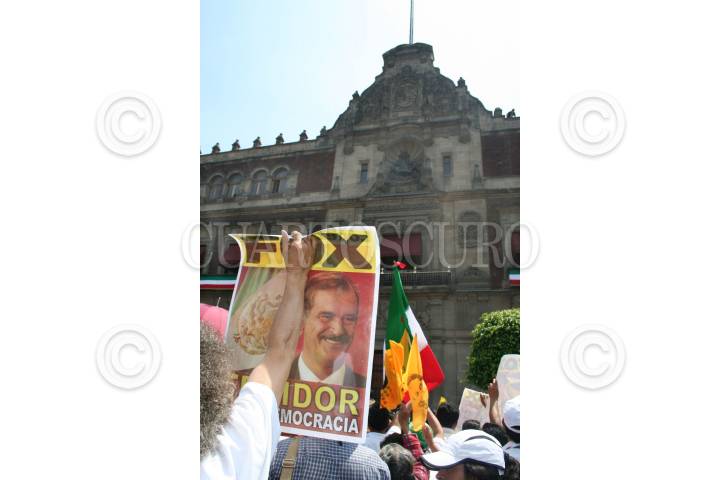 MÉXICO, D.F. 16SEPTIEMBRE2006.- Al finalizar el desfile conmemorativo de la gesta de independencia, simpatizantes de López Obrador mostraron pancartas con la leyenda "Traidor a la Democracia" y gritaron consignas al presidente Vicente Fox frente a Palacio Nacional. FOTO: PAOLA HIDALGO/CUARTOSCURO.COM