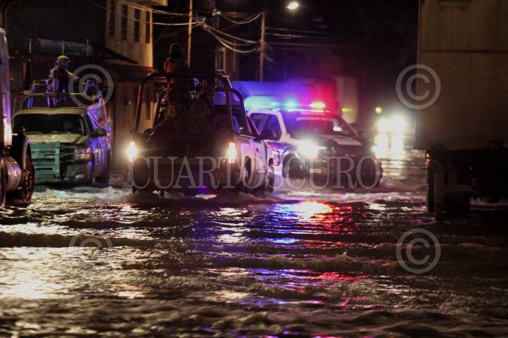 CUAUTITLAN IZCALL, ESTADO DE MÉXICO., 06JULIO2019.- Tras el desfogue controlado de la presa Ángulo, en el municipio de Cuautitlán Izcalli, para evitar que se desbordara, se vieron inundadas calles y avenidas de las colonias San Isidro e Infonavit, por lo que ejercito mexicano y policía local patrullaron la zona en apoyo a domicilios que se vieran afectados por esta acción tomada por el departamento de OPERAGUA de este municipio. FOTO: LUIS CARBAYO /CUARTOSCURO.COM
