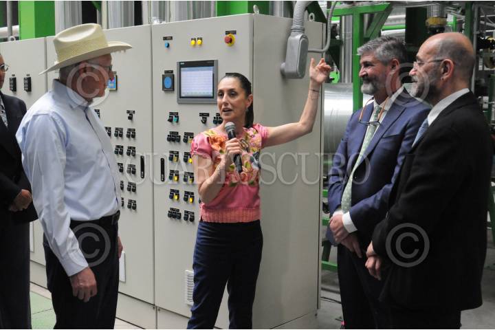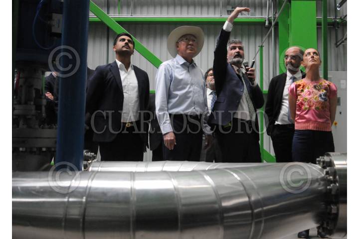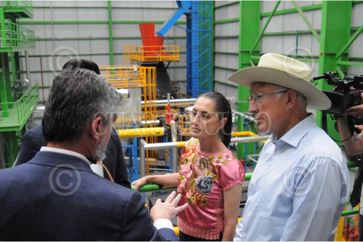 Claudia Sheinbaum y Ken Salazar observan los elementos que la planta procesa.