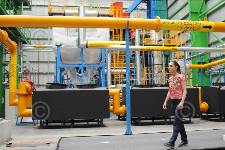 Claudia Sheinbaum, jefa de gobierno de la capital, participa en la explicación del funcionamiento de la nueva planta de carbonización.
