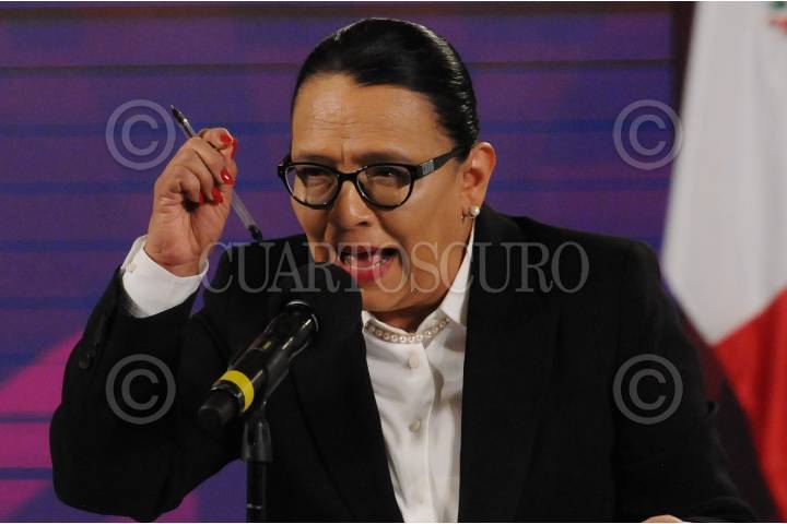 Rosa Icela Rodríguez, titular de la SSPC, responde la pregunta de los reporteros durante la conferencia.