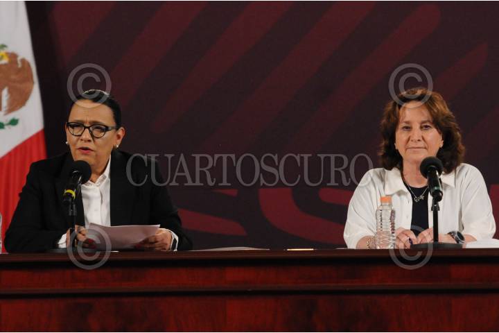 Rosa Icela Rodríguez, titular de la SSPC, acompañada de Sara Irene Herrerías, titular de la Fiscalía Especializada en Derechos Humanos, realizaron una conferencia para informar los avances de lo ocurrido la noche del lunes pasado donde 39 migrantes murieron.