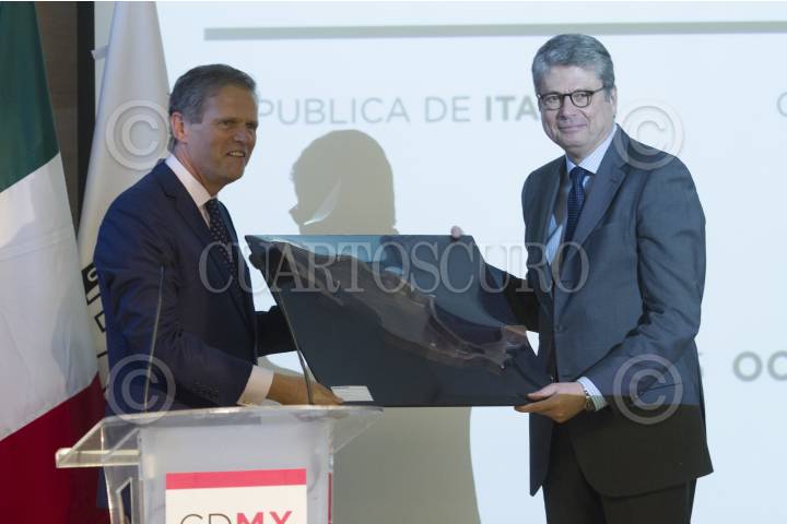 MÉXICO, D.F., 24JUNIO2015.- Duncan Taylor, embajador de Reino Unido en México, le entrega un reconocimiento Alessandro Bussaca, embajador de Italia en México, en el marco de la presentación de la séptima edición de Design Week México, que se realizó en el Museo Tamayo Arte Contemporáneo. Este año este encuentro de diseño de talla internacional tendrá como invitado al país italiano y al estado de Chiapas. FOTO: MOISÉS PABLO /CUARTOSCURO.COM