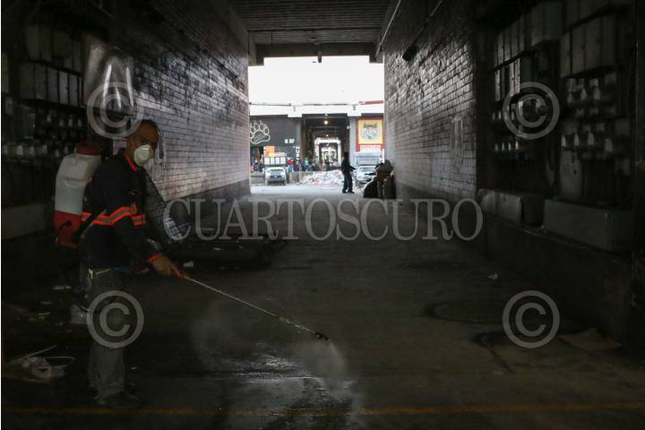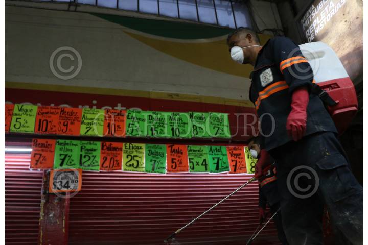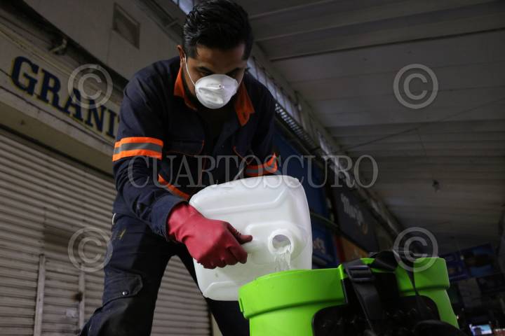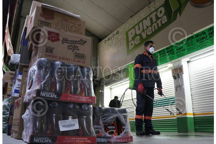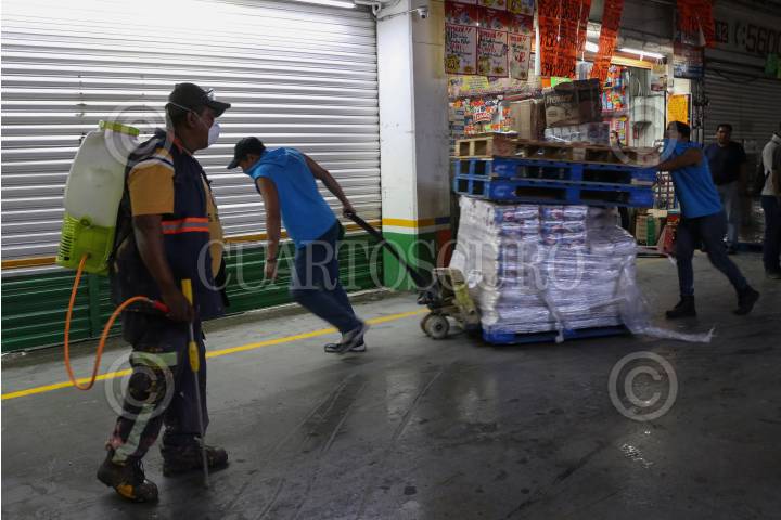 Limpieza y esterilización en la nave de abarrotes de la Central de Abastos frente al COVID-19.