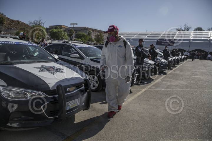 Unidades de la Policía Municipal fueron desinfectadas para evitar riesgos de contagios masivos de Covid-19 entre los oficiales.