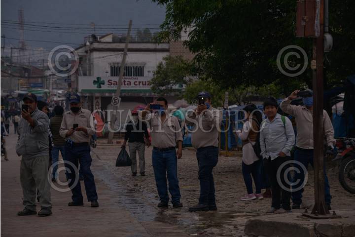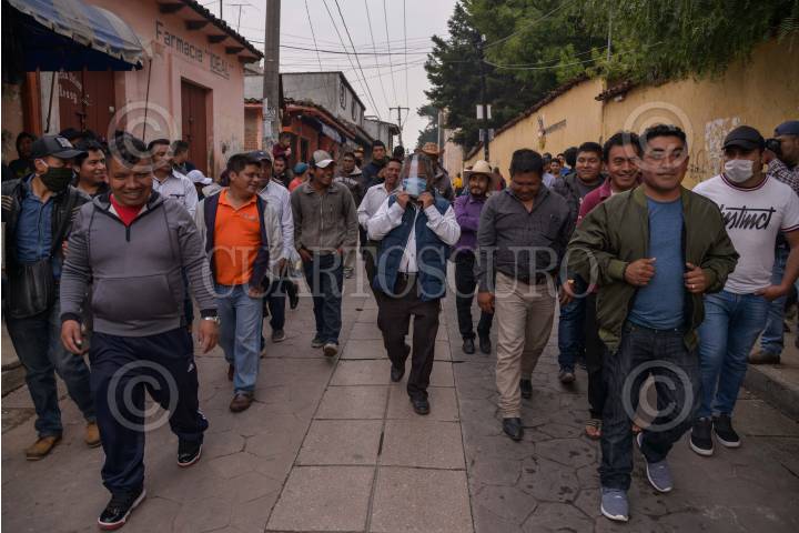 Integrantes de la Organización del Mercado Municipal Lic. José Castillo Tielemmans, caminan sobre la avenida 20 de Noviembre, después de acordar con las autoridades el inicio de la desinfección del mercado.