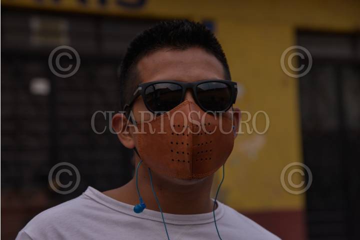 Un joven porta un cubrebocas elaborado con piel sintética mientras camina sobre la avenida 20 de noviembre minutos antes de ser desinfectada por trabajadores de la Secretaria de Salud Estatal.