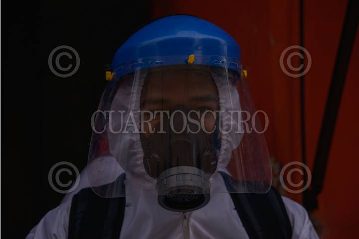 Un trabajador de la Secretaria de Salud Estatal se prepara para comenzar con los trabajos de desinfección del Mercado Lic. José Castillo Tielemmans.