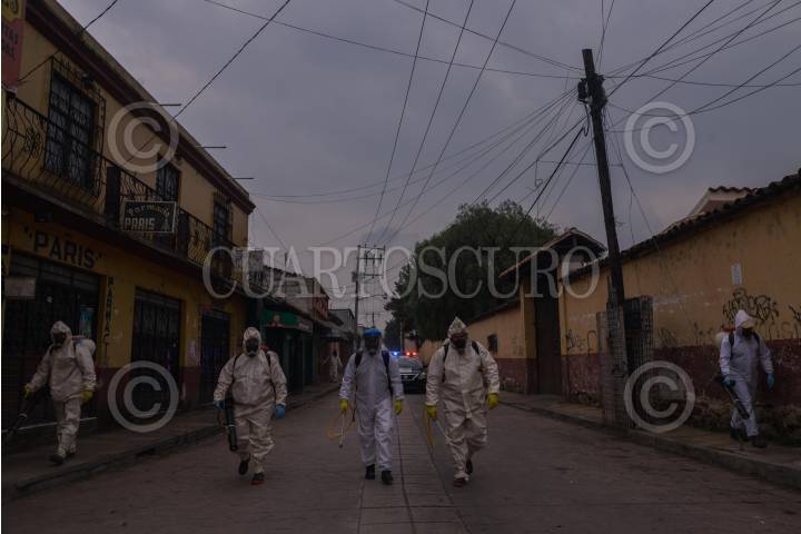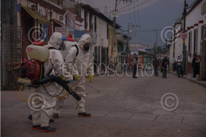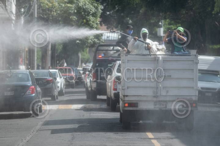 Trabajadores de la Secretaria de Salud del estado inician los trabajos de desinfección de las calles del centro de la ciudad.