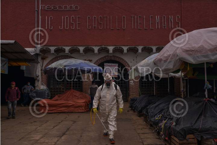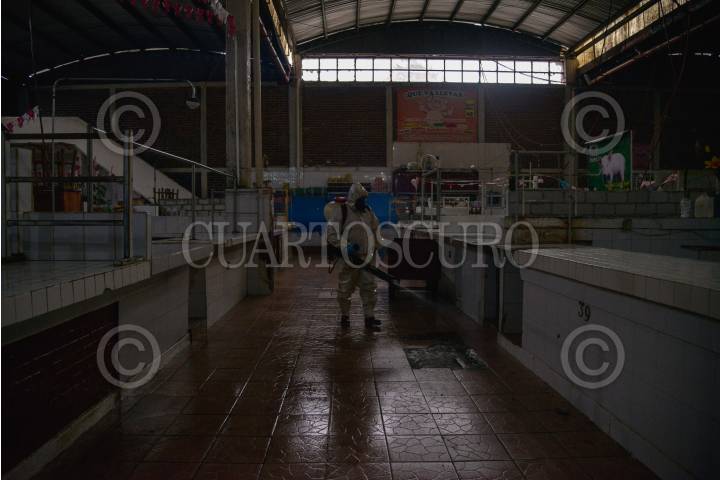 Un trabajador de la Secretaria de Salud Estatal desinfecta los pasillos del Mercado Lic. José Castillo Tielemmans.