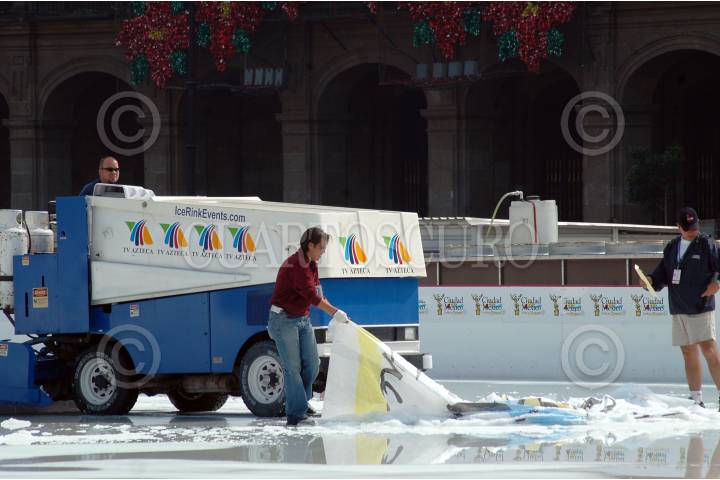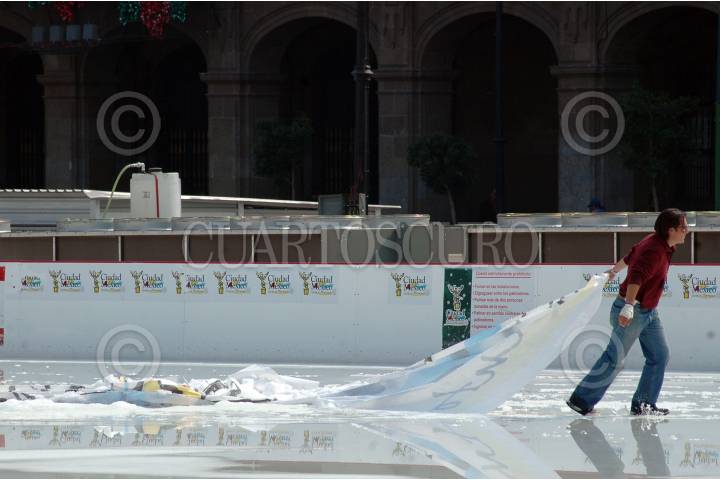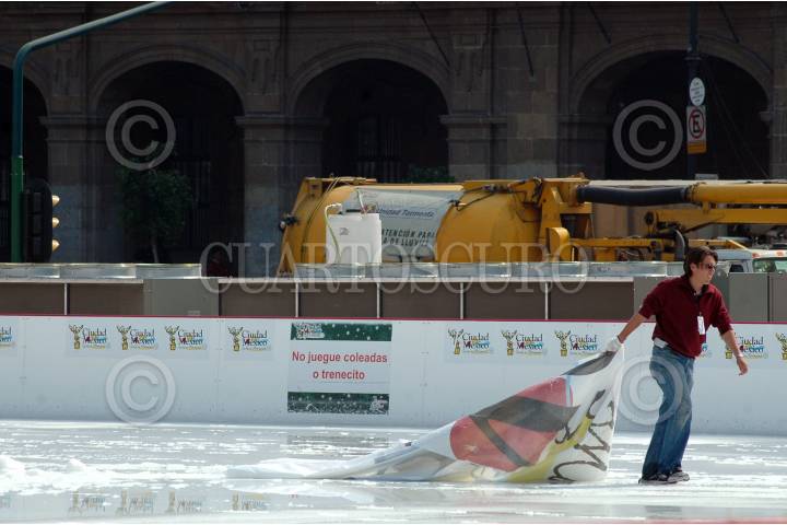 MÉXICO D.F., 13ENERO2008.- Trabajadores retiran el hielo y los logotipos del GDF en la pista de hielo que se encuentra en el Zócalo de la ciudad y que sera retirada por completo en estos días. FOTO: RODOLFO ANGULO/CUARTOSCURO.COM