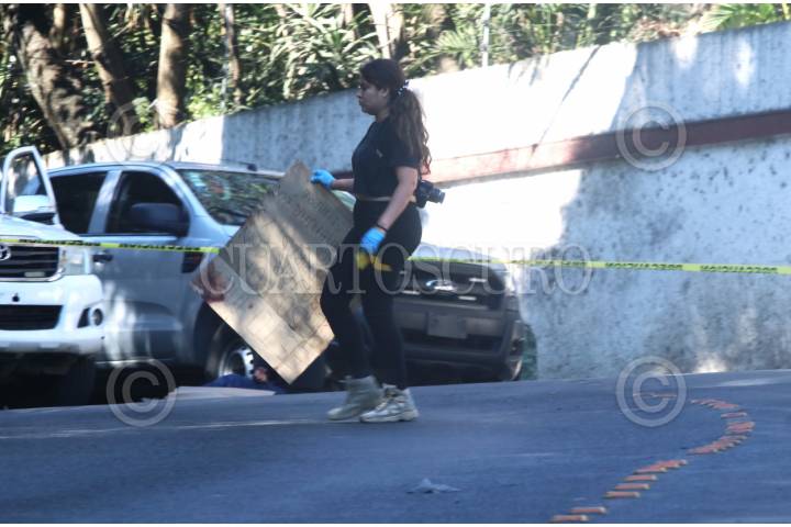 CUERNAVACA, MORELOS, 18MARZO2024.- Una perito en fotografía de la Fiscalía de Justicia de Morelos, lleva en su mano un cartón con un mensaje escrito, encontrado junto al cadáver desmembrado de un hombre dejado en la jardinera del monumento a Manuel Ávila Camacho. Un inicio de semana violento ha tenido el estado de Morelos, en la madrugada se reportó el homicidio de un joven que viajaba en su motocicleta por la calle Jesús H. Preciado; al amanecer trabajadores de un negocio de venta de pollos en Cuautla fueron atacados a balazos, resultando dos hombres heridos, después se reportó el homicidio de un hombre en Jojutla, y finalmente se reportó el homicidio de un hombre en la colonia Atlacomulco del municipio de Jiutepec. En todos los casos policía de Morelos y elementos del Ejército se acercaron a las escenas de crimen, resguardando el sitio en espera de la llegada de los peritos e investigadores de la Fiscalía quienes realizaran las investigaciones. Por último, trabajadores del servicio médico forense se encargó de levantar los cadáveres y llevarlos a la morgue en espera de su reconocimiento y reclamación. FOTO: MARGARITO PÉREZ RETANA/CUARTOSCURO.COM