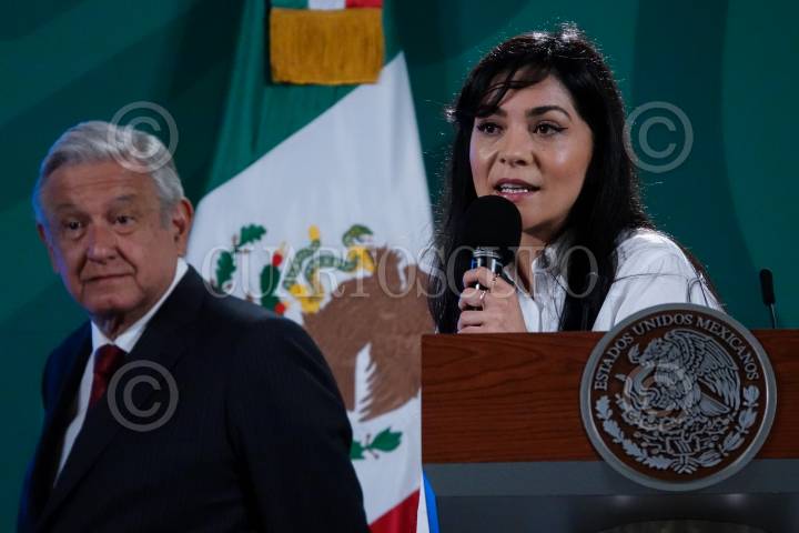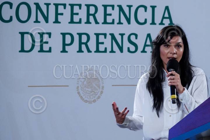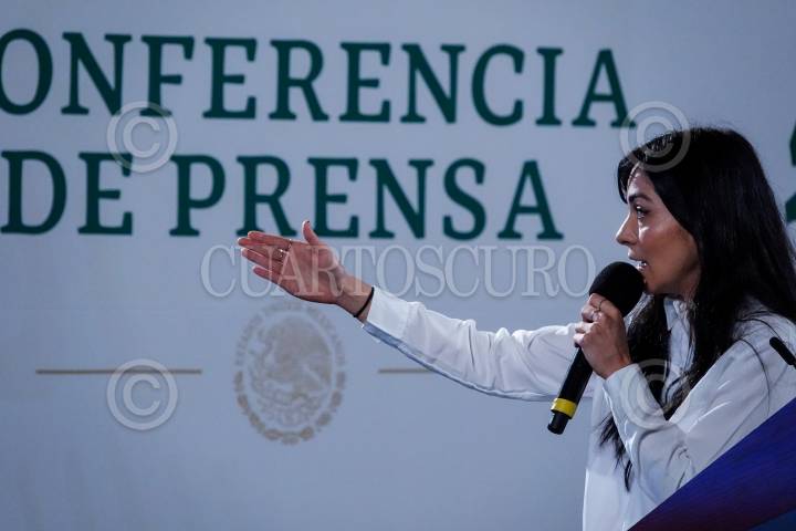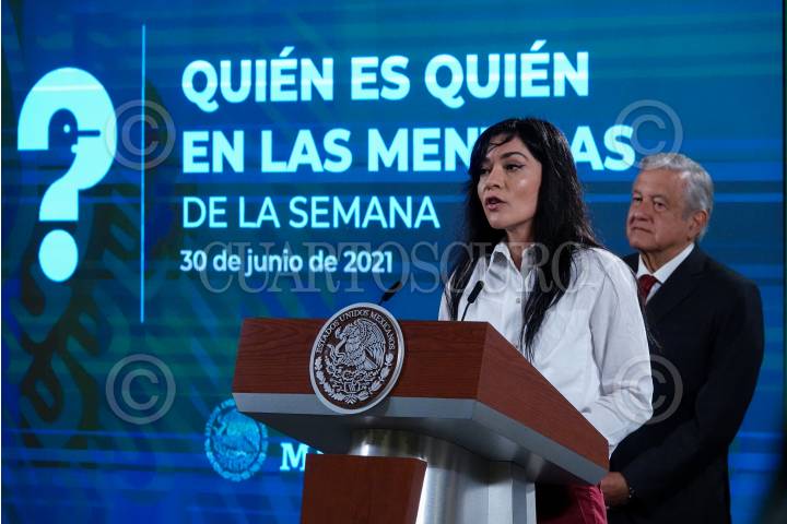 Ana Elizabeth García Vilchis durante la conferencia matutina donde se presentó la sección "Quién es quién en las mentiras de la semana".